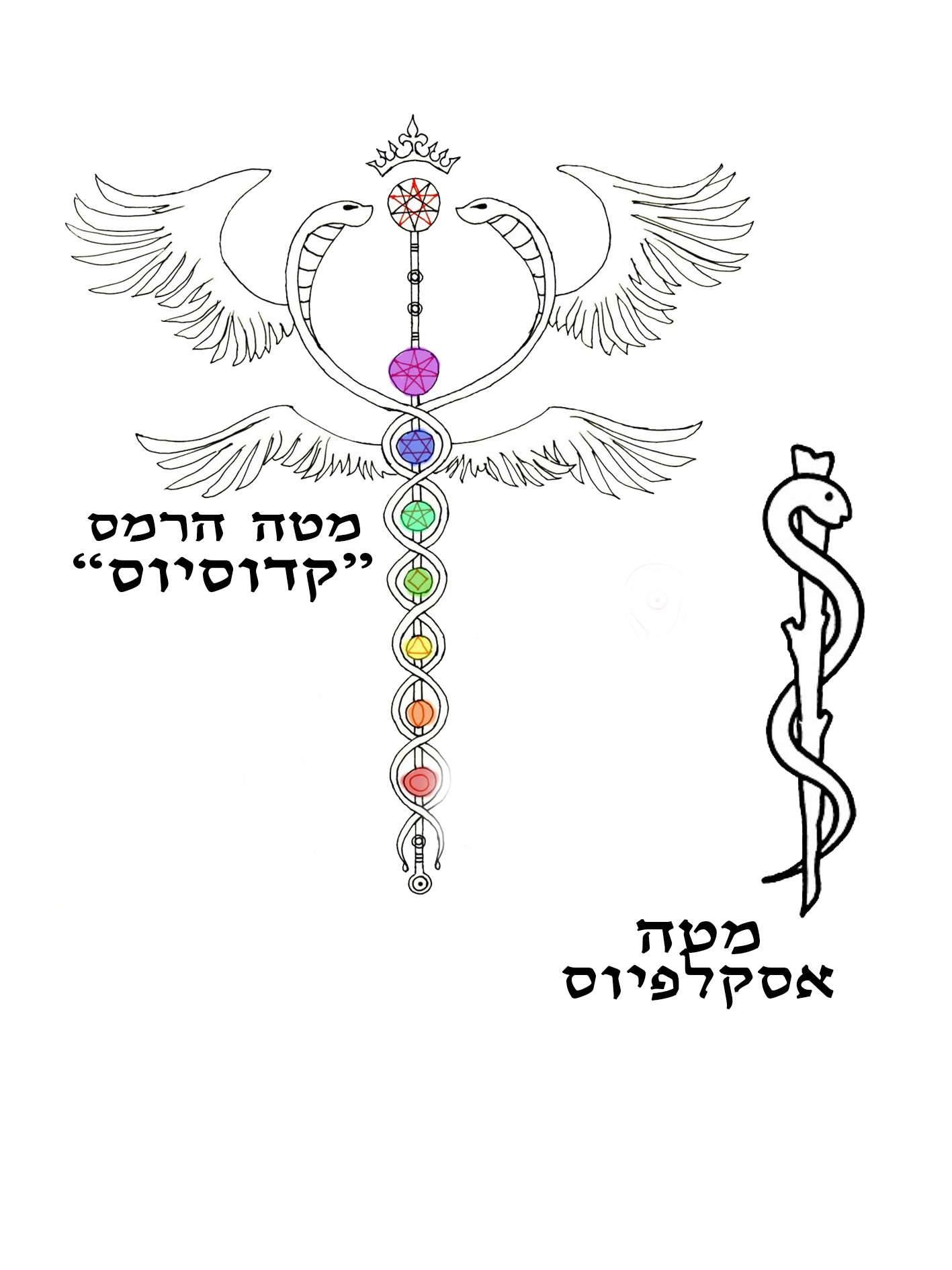 על המטה עטופים בספירלה 2 נחשים- למעשה כורכים את המטה 7 פעמים ובראשו נפרשות כנפיים.